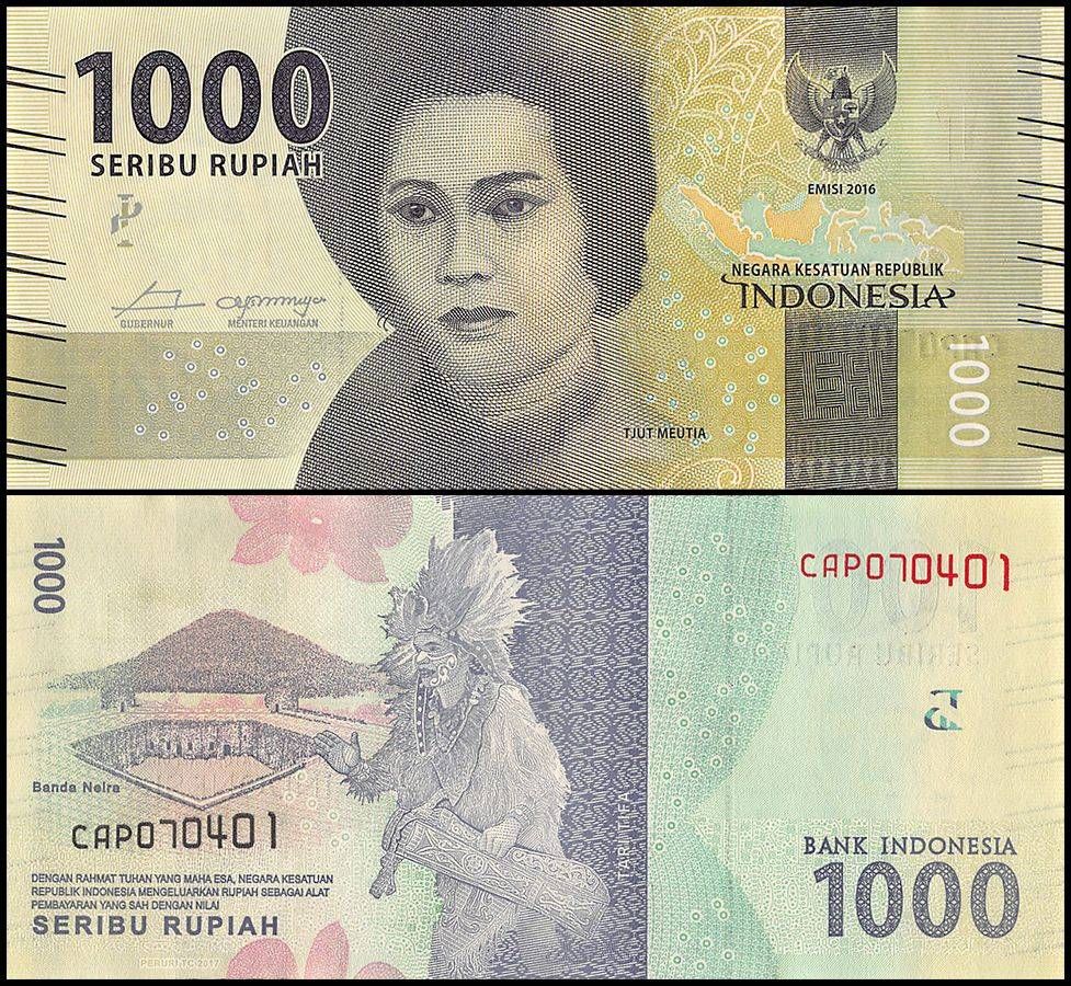 The Indonesia 1,000 Rupiah banknote is a part of the family of banknotes issued in 2017 to commemorate the State Defense Day. The obverse displays Tjut Meutia who was an anti-colonialist. The bank logo also appears on the front as the banknotes registration device. The map of Indonesia and the National Emblem is also visible. Centered on the bills reverse is a Tari Tifa which means a dancer with a drum. At the right part is the Fort Belgica in Banda Neira, Banda Islands which is located in Maluku Province. An orchid as well as the bank seal can also be found. The banknotes solid security thread has a printed BANK INDONESIA. Signed by Finance Minister Agus Martowardojo and Sri Mulyani Indrawati, the 141 x 66 mm paper money has Tjut Meutias portrait as its watermark.